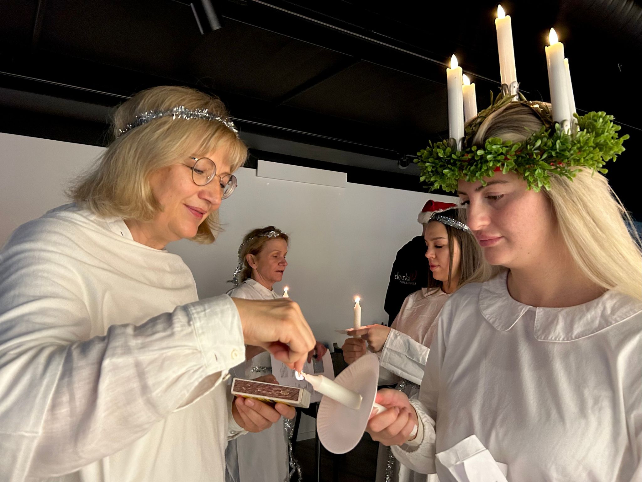 Årets fina luciatåg med deltagare och personal framförde traditionella luciasånger inför hela skolan på fredagen. Förberedelserna är här igång och ljusen tänds.